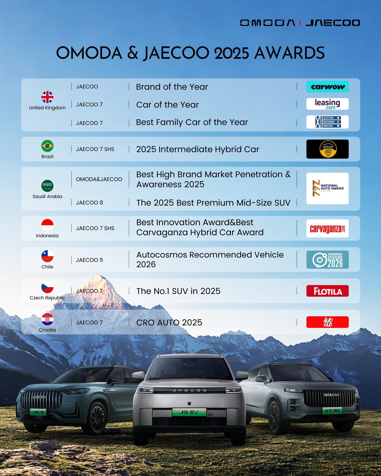 Một vài dấu mốc đáng chú ý bao gồm: J5 EV đã vinh dự nhận danh hiệu “EV của năm” tại Thái Lan; J7 được công nhận tại nhiều quốc gia như Anh, Ả Rập Xê Út và Brazil; Omoda 5 được bình chọn là “Xe được khuyến nghị nhất năm” tại Chile. Về mặt công nghệ, giải thưởng “Công nghệ PHEV của năm 2025” đã được Autobild Tây Ban Nha trao cho SHS Super Hybrid. Đồng thời, Jaecoo J8 SHS-P lập kỷ lục Guinness Indonesia với khoảng cách 1.660 km, góp phần củng cố hình ảnh về năng lực công nghệ hybrid của thương hiệu.